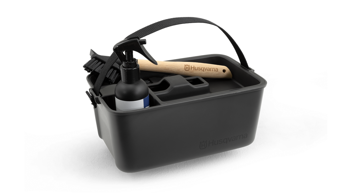 Ett rengörings- och underhållskit som gör det enkelt att hålla Husqvarna Automower® i perfekt skick. Det här kittet innehåller allt du behöver för att ta bort gräs och smuts och rengöra robotgräsklipparen under säsong. Kitet innehåller två borstar: en liten för smala och svåråtkomliga ytor och en stor som kan användas med en vattenslang. Husqvarna Active Clean Spray är enkel att applicera, avlägsnar smuts mycket effektivt och är både fosfatfri och biologiskt nedbrytbar. Särskilda fack i behållaren gör det lätt att förvara och organisera föremål som verktyg och knivar.