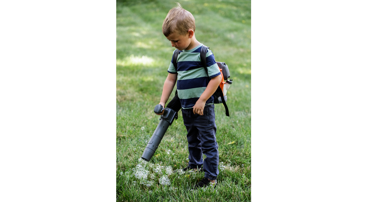 Ser ut som en riktig ryggburen lövblås! Passar barn från 3 år. Blåser en konstant ström av bubblor vid aktivering.